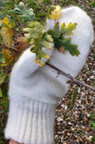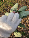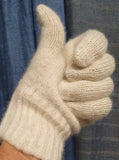 We can now offer GLOVES, FINGERLESS GLOVES, and MITTENS, knitted entirely of our own natural, undyed ivory-colored cashmere.